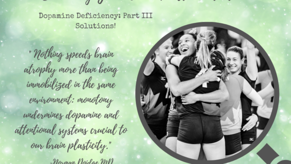 Increasing Vagal Tone: There is a direct correlation between low vagal tone and lower levels of dopamine. You’ll want to go back and review ALL the wonderful and fun ways you can improve vagal tone! (We talked about this a few months ago….use the search option in this group to find the posts.)
