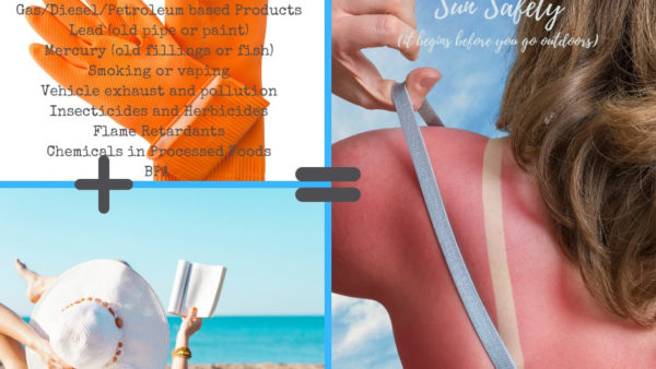 Sun exposure is super beneficial on many levels, not the least of which is its role in the body’s ability to synthesize Vitamin D. We should strive for daily exposure to the sun, not hide from it! Many people fear going out in the sun because they burn so very easily, and while melanin plays a part in whether or not you are prone to sunburn, the reality is that the risk of sunburn and sun damage rises the more “polluted” the inside of your body is. I’m a blonde haired blue eyed farm girl, and have lived this fact.