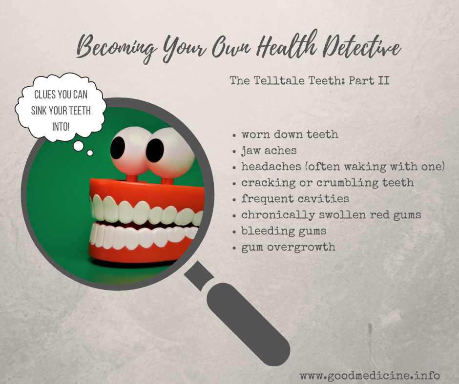 * Thin enamel or cracking/crumbling teeth are often clues of acid reflux. (We will go over acid reflux clues in greater detail soon.) Several medications may also affect the integrity of teeth. Asthma medications (inhaled), chewable aspirin, birth control pills, immunosuppressive agents, chemotherapy agents, and any of the 400+ meds that cause dry mouth ( revisit that section for more details) are among the bigger culprits. If you find yourself in a situation where any of these medications are deemed necessary, make sure you are rinsing your mouth out often with Thieves Mouthwash to create an inhospitable environment for bad bacteria that may want to set up camp and create further damage.